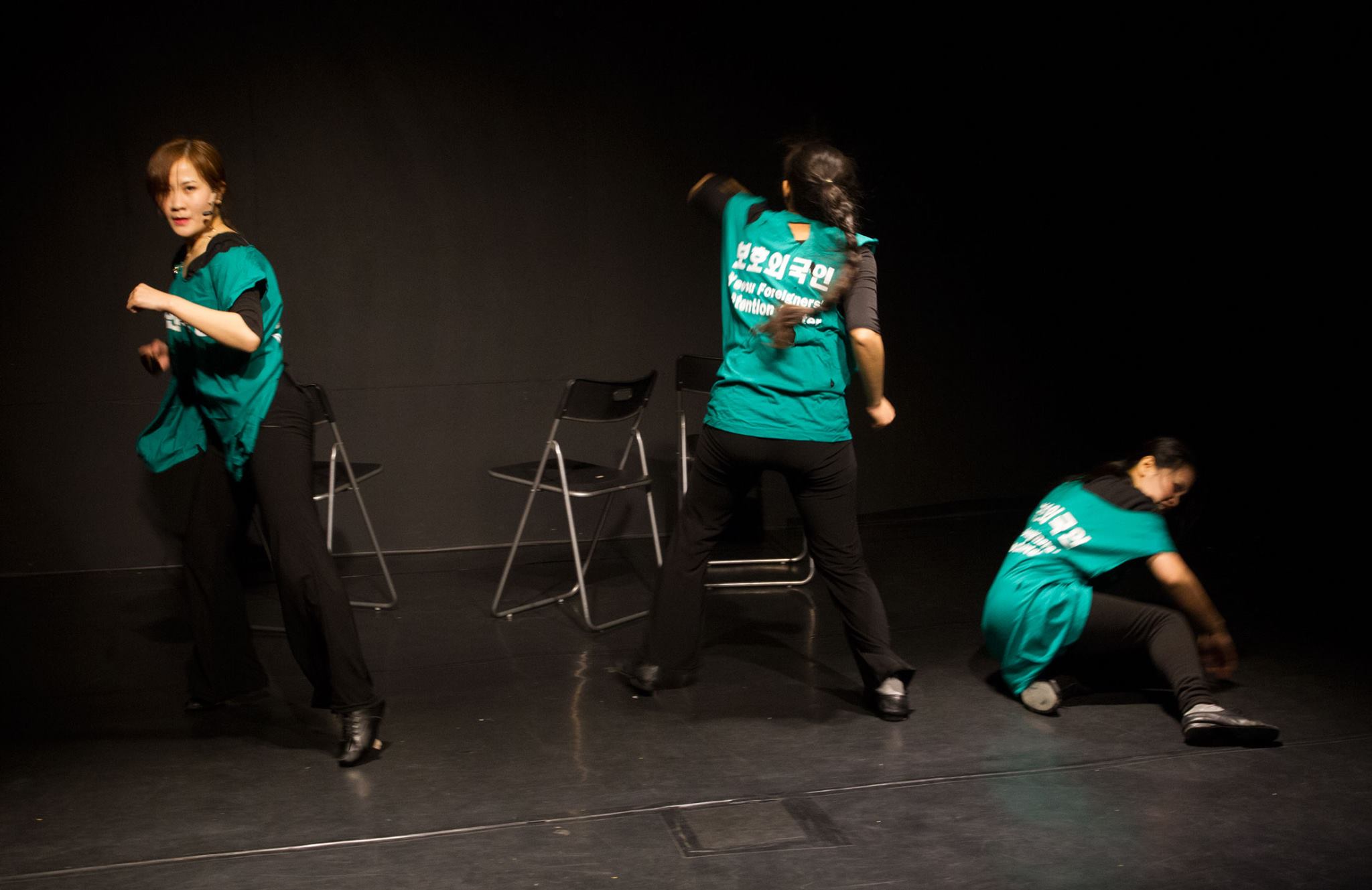 첫 장면은 공연 속 허구로 짜여진 기자회견으로 연출자 박경주가 여수에서 이주노동자 지원활동을 하고 있는 정병진 목사를 전화로 연결해 여수 외국인보호소 화재참사의 진실을 인터뷰했다.