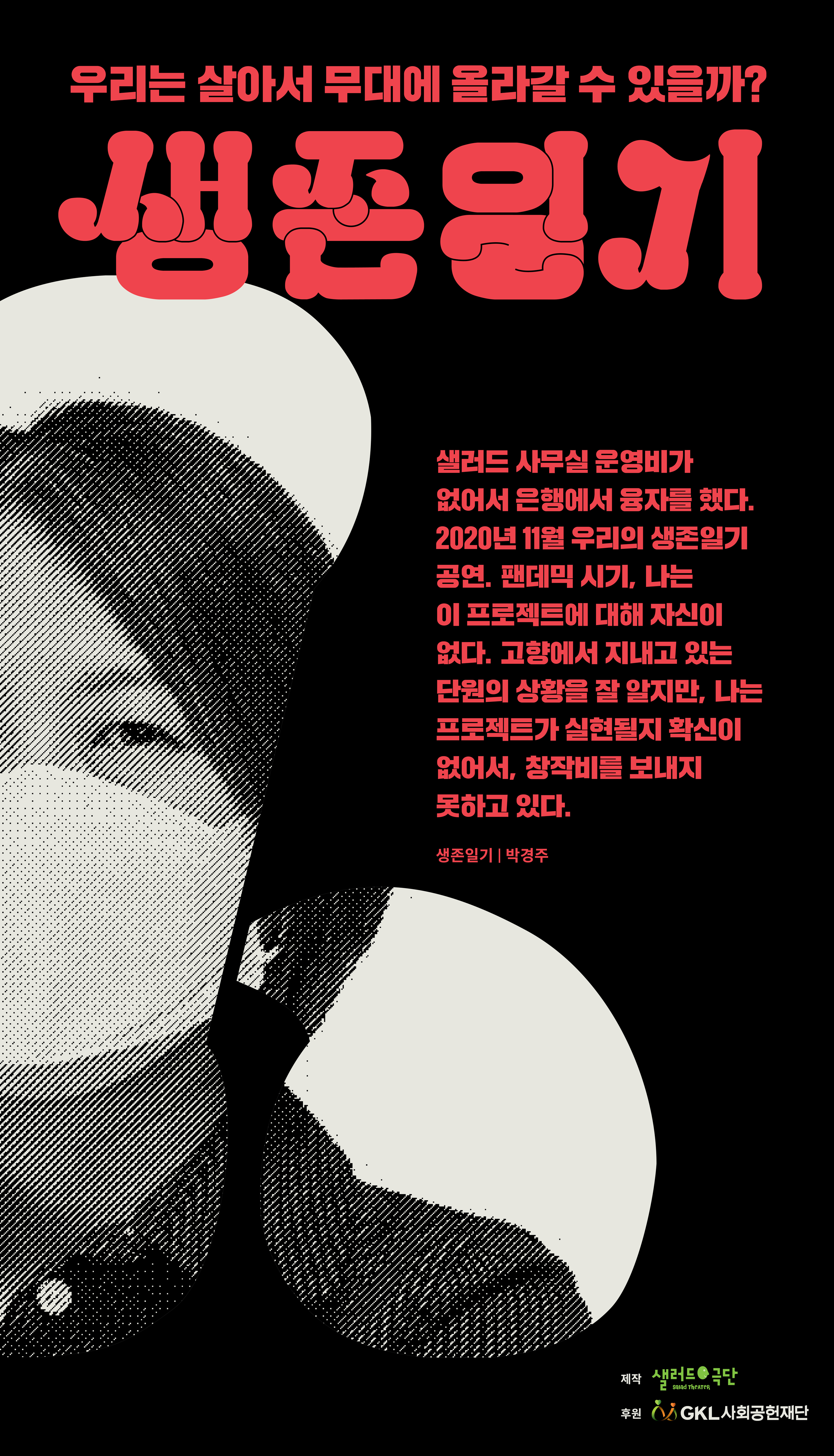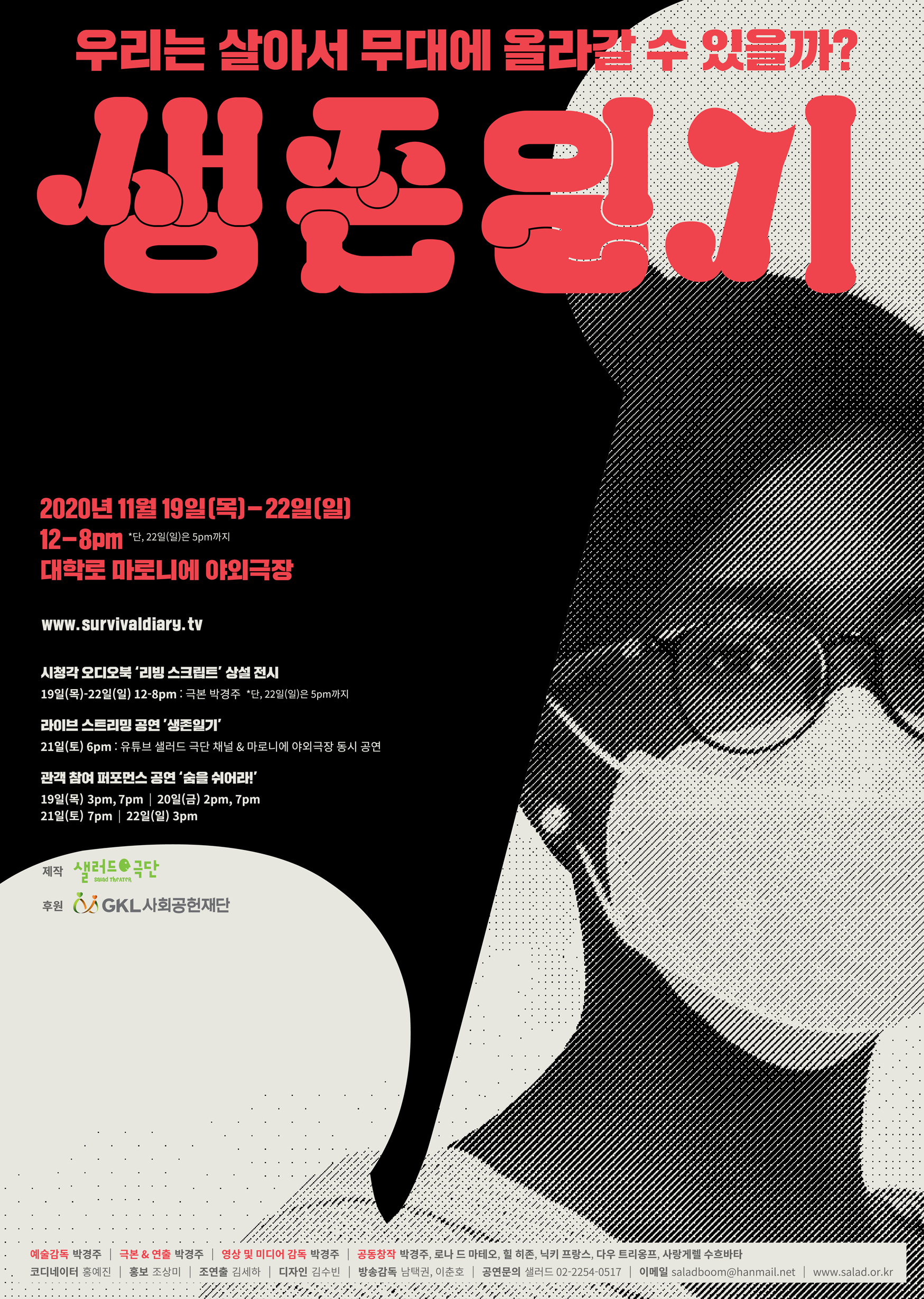 샐러드가 제작하고GKL사회공헌 재단이 후원하는 ‘생존일기’ 공연은 오는 11월 21일 오후 6시 유튜브 샐러드 극단 채널과 대학로 마로니에 야외극장에서 온라인 생방송 형식으로 동시 진행되며, 공연 당일 한국에 입국하지 못한 단원들은 ZOOM으로 연결돼 공연에 참여할 예정이다. 몽골과 필리핀, 한국에 거주하고 있는 단원들이 ZOOM을 통해 연결되고 이 화면은 대학로 마로니에 야외극장 무대에 설치된 대형 LED 모니터를 통해 관객을 만난다. 마로니에 야외무대 공연과 ZOOM 화상회의 영상은 실시간 편집돼 유튜브 샐러드 극단 채널을 통해 송출될 예정이다. 박경주 연출이 직접 사회를 볼 예정인 ‘생존일기’ 온라인 생방송 공연에 단원들 모두 참여할 수 있을지 아직 불투명하다. 왜냐하면 팬데믹은 아직 종료되지 않았기 때문이다. 즉 우리 모두 끝까지 살아남아 있을지 아직 불확실하다.