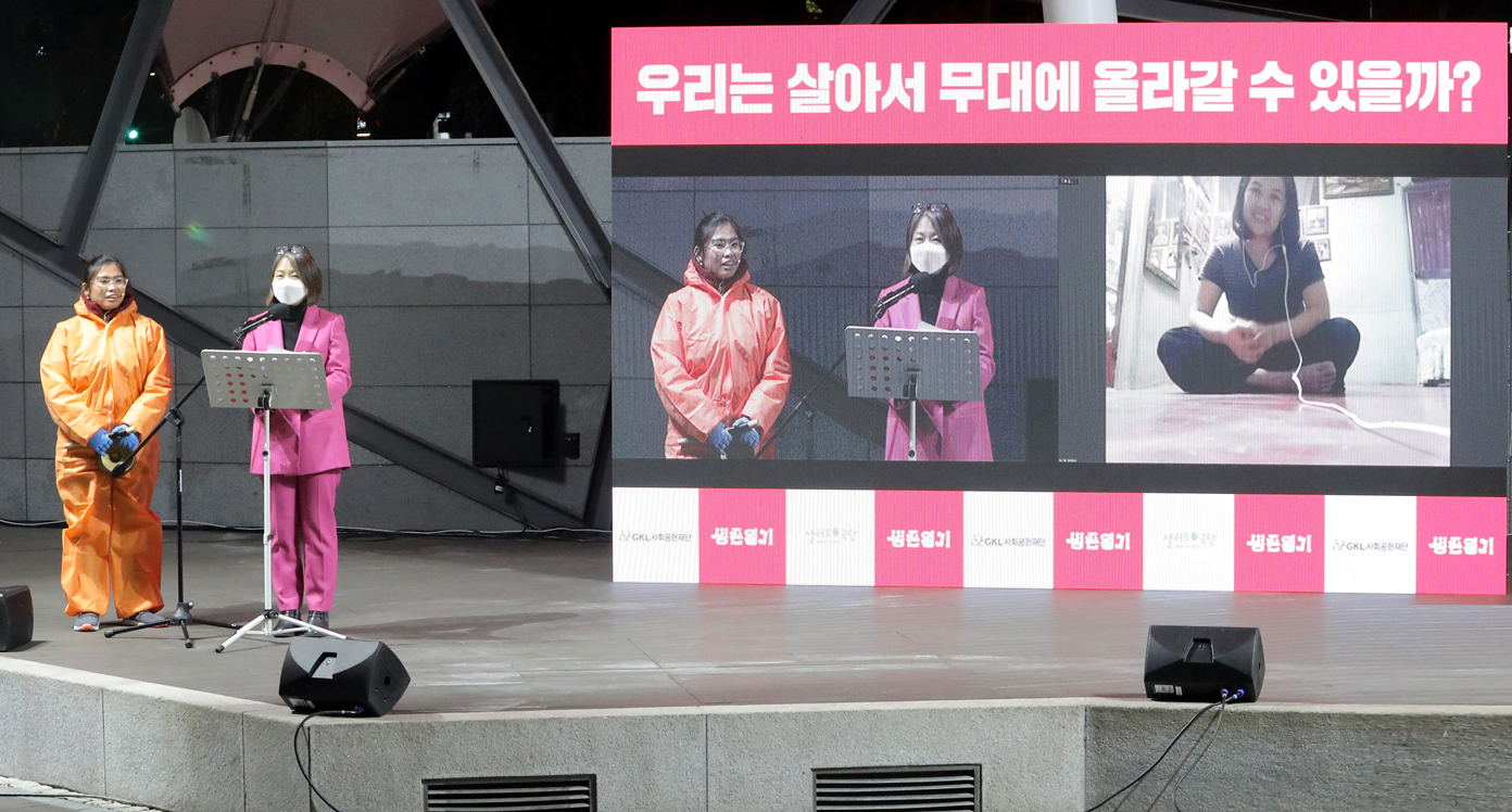 다문화 극단 샐러드는 지난 19일부터 22일까지 총 4일간, 극단이 겪고 있는 팬데믹 상황을 담은 신작 ‘생존일기’(연출: 박경주) 공연을 GKL 사회공헌 재단의 후원으로 마로니에 야외 공연장에서 진행했다.