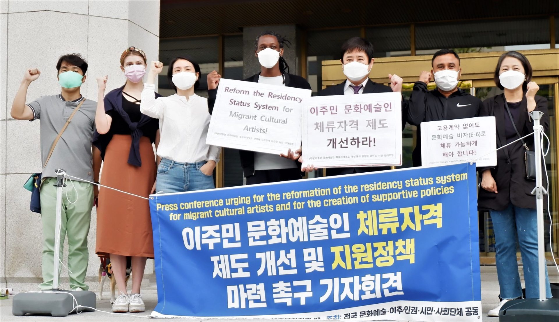 A committee for the Reformation of the Residency Status System for Migrant Cultural Artists held a press conference on 29 September 2021 in front of the Sejong Center for the Performing Arts, Gwanghwamun square in central Seoul, calling to the Korean government for the creation of supportive policies.
