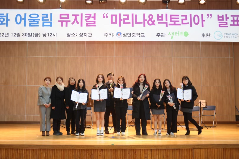 성안중학교가 주최하고 샐러드 극단이 주관하며, 양원선 재단이 후원한 성안중학교 다문화 어울림 뮤지컬 프로그램은 전교 학생의 10%가 중도입국자녀로 구성된 성안중학교에서 서로 다른 문화의 학생들이 만나면서 겪을 법한 문화적 갈등 및 학교폭력 상황을 해결하고, 다문화에 대한 편견을 극복하며 서로 존중하는 문화를 만들기 위해 진행되었다.