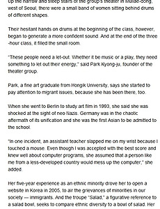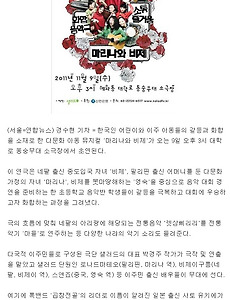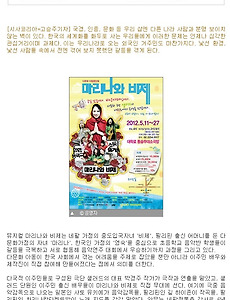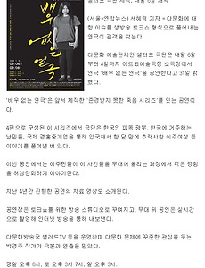 분류 전체보기255 다문화 이슈 생방송 토크쇼 - 세계일보 2015. 7. 18. 다문화를 말하다 … 배우 없는 연극 2015. 7. 18. Theater heals migrant women -koreatimes 2015. 7. 18. 극단 샐러드 다문화 대안공간 개관한다-연합뉴스 2015. 7. 18. 가면 속의 비밀 -연합뉴스 2015. 7. 18. 마리나와 비제- 시사코리아 2015. 7. 18. 다문화가정 낯섦을 공감으로- 소년조선일보 2015. 7. 18. 마리나와 비제 초연 -연합뉴스 2015. 7. 18. 란의 일기 개정판 - 서울연극 2015. 7. 18. 란의 일기 개정판 -연합뉴스 2015. 7. 18. 행복한 다문화 치장에 반기 들고파 -주간 한국 2015. 7. 18. 연극 란의일기-한겨레 2015. 7. 18. 극단 샐러드의 여수 처음 중간 끝 -한겨레 2015. 7. 18. 소년동아- 마리나와 비제 공연 올리는 다문화 극단 샐러드 2015. 7. 18. 국내외 복권소식 "샐러드' 2015. 7. 18. Trans Office Theater UUU Project An Experimental Art Project by Kyongju Park - Artists’ Social Performance about Artistic Labor There is no future for government-led social enterprises. Only empty voices about a sustainable future and job creation for marginalized people, etc. exist. Unfortunately, cultural and art companies are not companies unless large companies accumulating absolute wealth in Korea transform themselves firs.. 2015. 7. 17. 다문화 창작뮤지컬 공연 OSTV 2012 2015. 7. 16. Future Story 2012 Art Center Nabi event performance Date: 4 pm on Sep. 21th 2012Place: Art center Nabi, In front of Chinese Embassy in Korea, Broadcasting through the web (undergroundartchannel.net), Mae Sod thailand, Sendai Japan. Duration: 90 min.Production: SaladPlanning: Kyongju ParkWriting/Directing/Video Editing: Kyongju ParkChoreography: Yuko Kaseki Media director: Sungsuk SukMusic director: Sato Yuki.. 2015. 7. 16. 샐러드 언론보도 현황 요청기관게재일제목1동아일보2009.03.04[달라도 다함께/함께 사는 법] 연극 도전하는 결혼이주여성들 '무대 위의 수다'2연합뉴스2009.04.11동작을 연습하는 극단 샐러드 이주여성들3비즈플레이스2009.06.22수출입은행, 사회연대은행에 창원지원금 기탁4세계일보2009.07.21[다문화 한가족 시대]⑬수출입은행 '창원지원 프로그램'5세계일보2009.07.21"무담보 소액대출사업지원 결혼이주여성 창업 도울 것"6경향닷컴2009.09.042009 월미 평화축제7조선닷컴2009.09.10월미 평화축제8경향닷컴2009.09.11주말 도심서 맛보는 '평화'․․․2009 월미평화축제 12․13 개최9연합뉴스2009.09.21이주여성들 연극 '맛있는 레시피' 개막10국민일보2009.09.24연극으로 이야기하는 .. 2015. 7. 16. 미래이야기 Future Story Date: 8 pm on July 17th ~ 18th, 2012 Place: Seoul Art Space Mullae Box Theater, Seoul station, live broadcasting through the web (www.undergroundartchannel.net), Mae Sod thailand, Sendai Japan. Duration: 90 min. Co-production: Salad, Seoul Marginal Theatre Festival Planning: Kyongju Park Writing/Directing/Video Editing: Kyongju Park (www.kyongjupark.com) Choreography: Yuko Kaseki Media director:.. 2015. 7. 15. 이전 1 ··· 4 5 6 7 8 9 10 ··· 13 다음