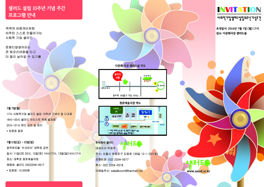 사회적기업 샐러드가 오는 7월 7일(월)부터 13일(일)까지 일주일간을 설립 10주년 기념주간으로 정하고 다양한 행사를 갖는다. 이번 행사는 샐러드가 지난 5월 사회적 기업 인증을 취득함을 축하하기 위해 기획됐다.