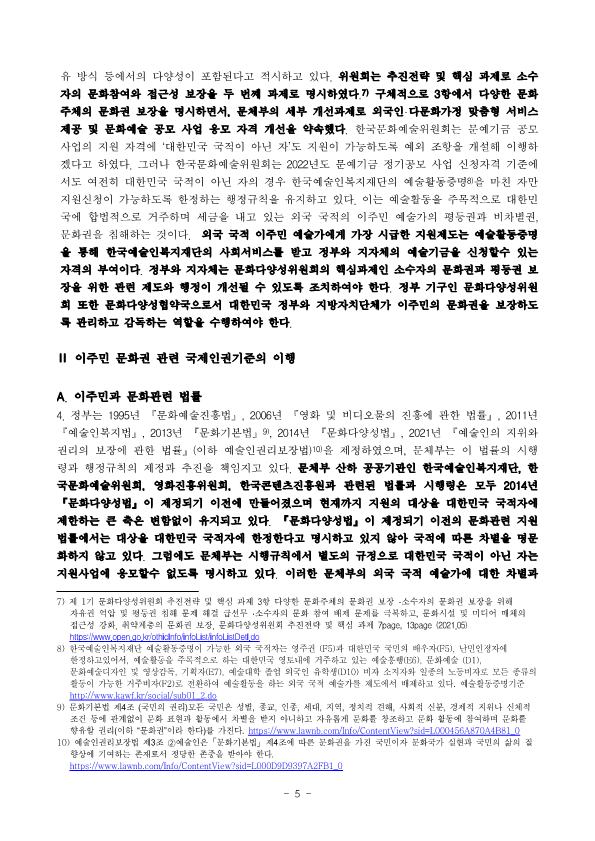 그러나 정부는 외국 국적 예술가에 대하여 국적에 따른 문화적 차이를 이유로 문화적 표현과 문화예술활동의 지원이나 참여에 대한 보장을 제공하지 않고 있어서, 문화다양성의 보호와 증진에 관한 법률 제3조 3항의 이행을 유보하고 있으므로 이에 대한 구체적이고 즉각적인 입법, 행정 분야의 이행이 이뤄져야 합니다.