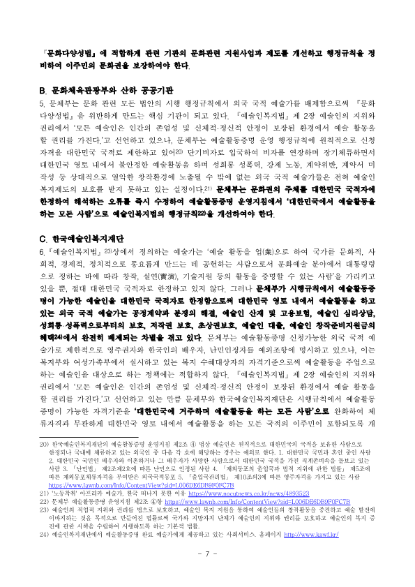 문체부는 『예술인권리보장법』 시행에 맞춰 예술인의 편의를 위해 예술인복지법과 예술인권리보장법 관련 접수처를 한국예술인복지재단으로 일원화하기로 결정하였습니다. 그러나 외국 국적 이주민 예술가에게는 창구를 일원화하여 주지 않고 예술활동증명 제도에서 배제하는 것은 문화 예술 산업 분야의 소수자로서 외국 국적 이주민에 대한 차별이고 불평등입니다. 문체부가 외국 국적 예술가를 예술활동증명 자격에서 제외시킴으로 인해 외국 국적 예술가는 공정계약과 분쟁의 해결, 예술인 산재 및 고용보험, 예술인 심리상담, 성희롱·성폭력으로부터의 보호, 저작권 보호, 초상권보호, 예술인 대출, 예술인 창작준비지원금의 혜택에서 완전히 배제되는 차별을 겪고 있습니다. 2021년 대한민국은 OECD 10위 국가로 급부상하였습니다. 정부는 그 위상에 맞춰 프랑스와 독일, 영국, 스위스, 네덜란드, 미국 등 해외 문화선진국가의 규정과 동일하게 모든 문화예술지원사업 지원자격과 예술활동증명 가능 자격을 ‘대한민국에 거주하는 모든 사람’으로 변경하여야 합니다.