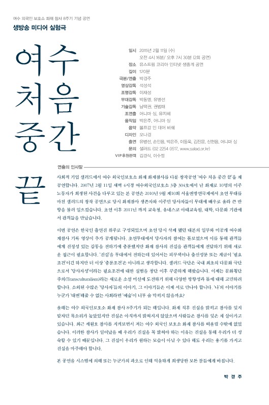 사회적 기업 샐러드에서 여수 외국인보호소 화재 화재참사 8주기를 맞아 를 창작공연 ‘여수처음 중간 끝’의 재공연을 오는 2월 11일 (수) 생방송 미디어 실험극의 형태로 무대에 올린다.