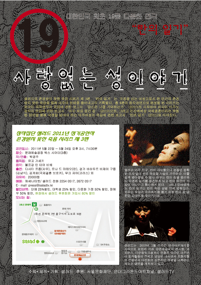 존경받지 못한 죽음 시리즈 Ⅲ본 시리즈는 샐러드가 국경을 넘는 노동자로서 한 인간의 존경받지 못한 죽음을 통해 이주의 문제를 풀어내고자 기획한 창작 공연 시리즈다. 총 4편의 작품으로 완성될 이 시리즈는 한국인 파독광부의 죽음으로부터 시작, 여수 외국인 보호소 화재 사건의 죽음으로, 그리고 결혼이주여성 란의 죽음으로 이어진다.